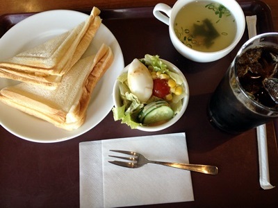 駅内を物色するが駅弁はコンビニで売ってる「かつおめし」しかないし、他に店も開いてないので「eki cafe」でホットサンドモーニングセット。四国らしくはない。まあしょうがないか。朝だし。ワンコインだし。