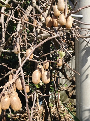 のいち動物公園目指して歩く。徒歩25分。昨日までは涼しかったようだが、熱帯低気圧が通り過ぎて天気がよくなり暑い。途中民家の庭にキウイ。南国だ。こんな感じでなるのか。