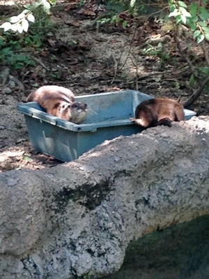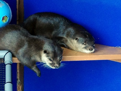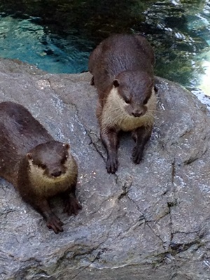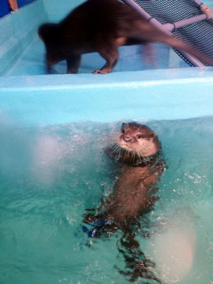 目当てはもちろんコツメカワウソ。行ってみるとプールが3つに分かれている。2つがコツメカワウソ、1つはツメナシカワウソ、と。真ん中のコツメ舎ではハルとメメの美獺ペアが朝から遊んでた。