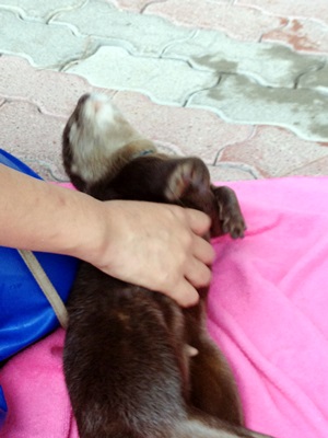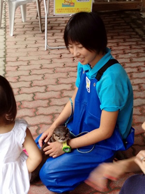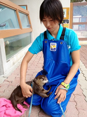 15時半に水族館に戻り、王子の散歩を待つ。16時、散歩を前に飼育員さんに体を拭いてもらう王子。王子は別府のうみたまご生まれで人工飼育だったため人間大好き。