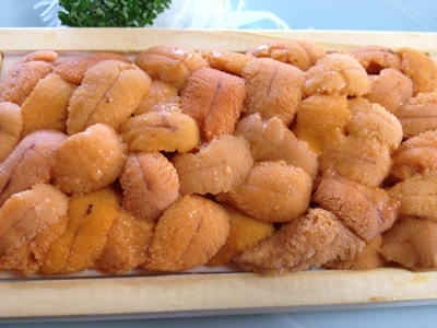 バフンウニ。実際この板盛りで札幌市内なら5000円はする。