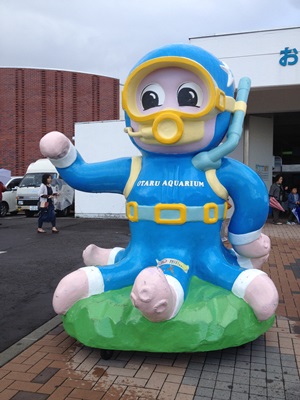 歩いておたる水族館に。空は晴れてるが天気雨が降り、強い横風。