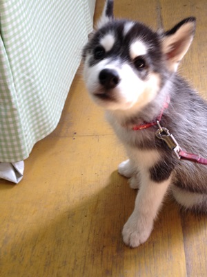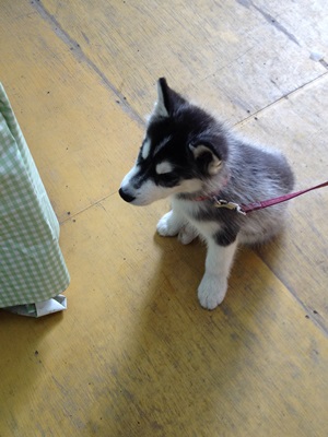 バスの時間が読めないので予定より早めに市内に戻ることにしてノースサファリサッポロを出ようとすると出口に門番のように生後3ヶ月のハスキーが。