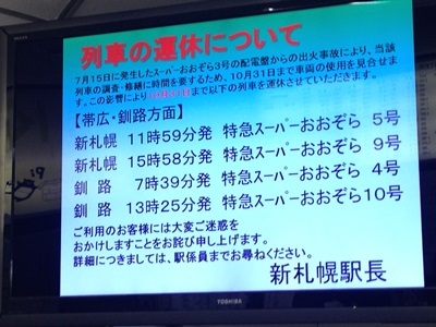 イライラ来るお子様が多くなったので早めに水族館を出てJRの新札幌駅に。7月の事故の影響で特急がやたら運休。今回は始めっから札幌近郊のカワウソ4ヶ所しか想定してなかったけど、もしあちこち行くつもりにしてたら計画頓挫したかもな。