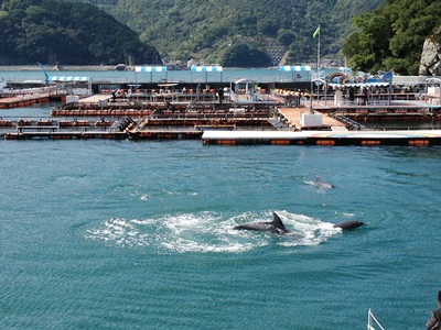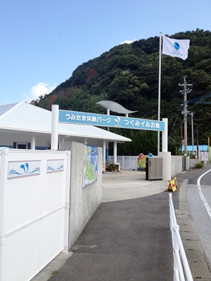 バスは約20分で半島の中ほどにあるつくみイルカ島に到着。料金610円。入口が道の駅っぽいマルシェになってて、そこを通り抜けると有料のイルカ島という変わったつくり。うみたまごと市の共同運営施設なのかな?駐車場は中学校の跡地のようだし。