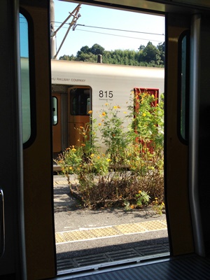 ホームにコスモス(撮ろうとしたらドア閉まった)
