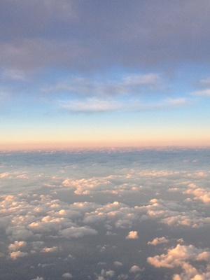 15時10分発のはずが滑走路で20分待機後ようやく離陸。夕方に西に向かって飛ぶと窓からの景色はこんな感じ。