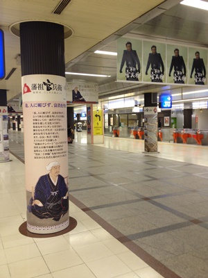 博多駅。来年のNHK大河ドラマ「軍師官兵衛」のポスターだらけ。官兵衛は確かに福岡黒田藩の藩祖ではあるが、自身はほとんど福岡にはいなかったのでは?
