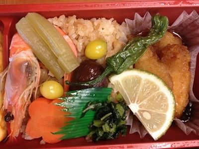 遅い昼飯は駅弁「幸ふく弁当」。まあうまい。