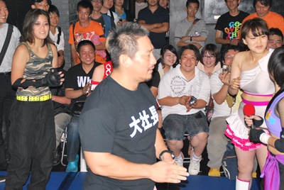 桃知が再度木場に振る(左写真)。木場「イベントも5回やることができましたけど、リングで試合するのがデビューだと思ってます。」