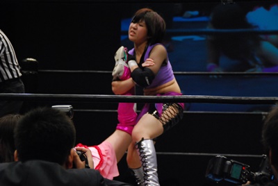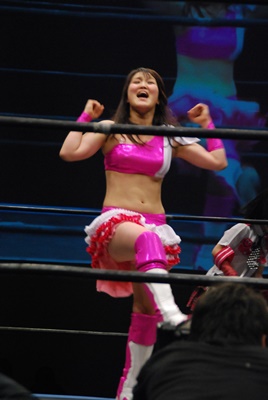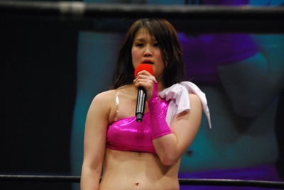 山下「今勝って、3カウント木場から取ったんで、私が東京女子プロレスのエースです!だけど、今日、たくさんの選手がデビューして、まだ闘っていないので闘いたい。」(左写真)