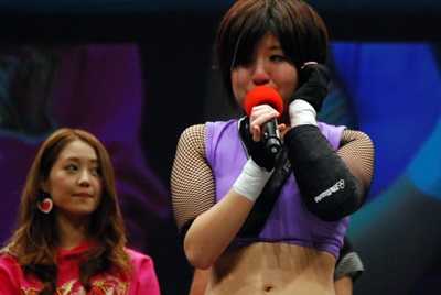 木場「東京女子プロレス旗揚げ戦にご来場いただき、ありがとうございました。私たちは今年の1月から旗揚げを目標にずっとマットでやってきました。やっと今日、旗揚げ・・・旗揚げできました。」感極まる(左写真)。