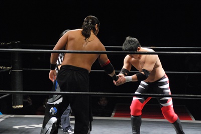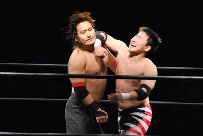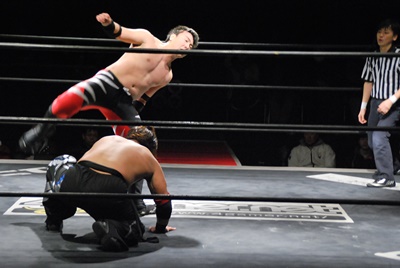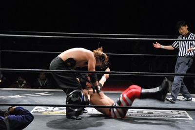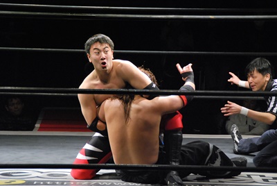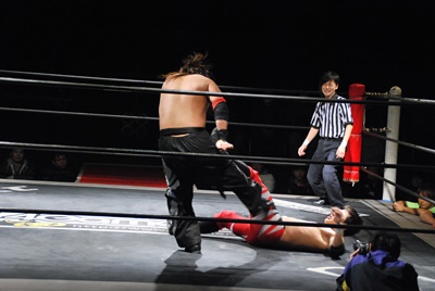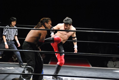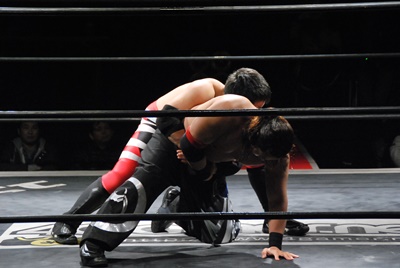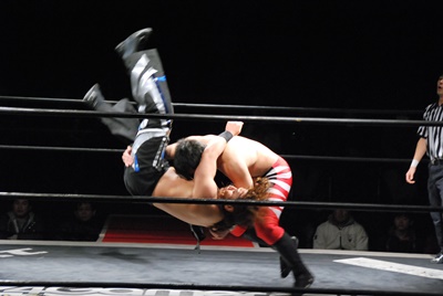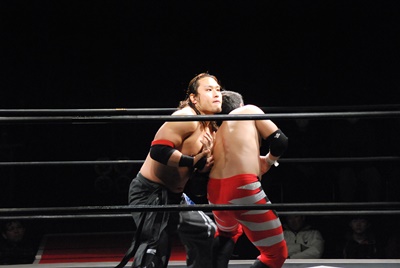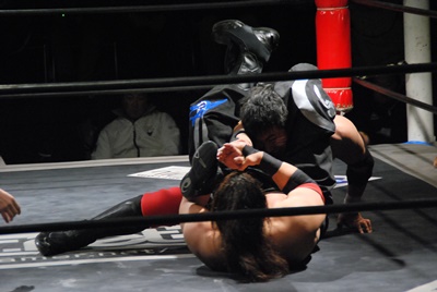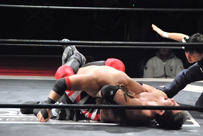 妻木リングに戻すとコーナーに振って串刺しエルボー、再度突っ込む、大家キック。大家突っ込む、妻木キャッチしてアバランシュホールド(左写真)、