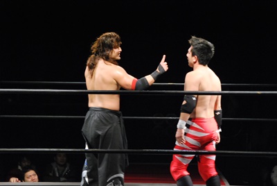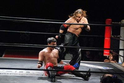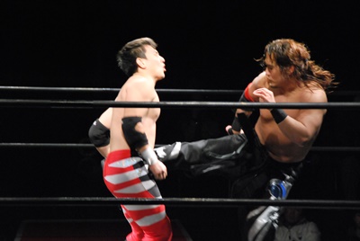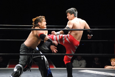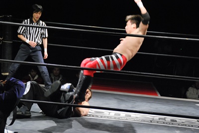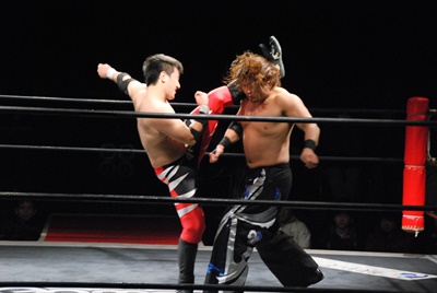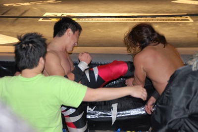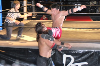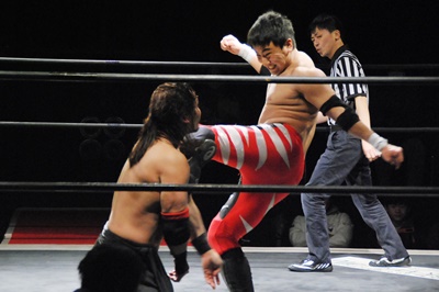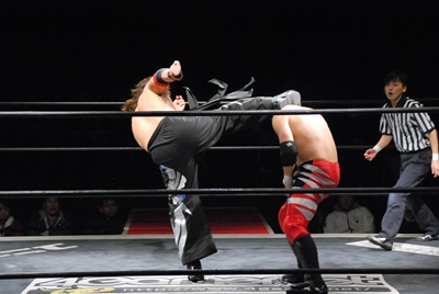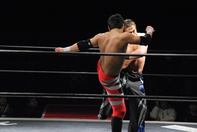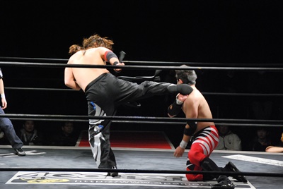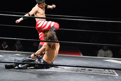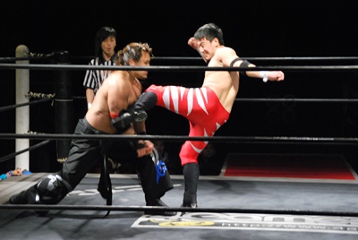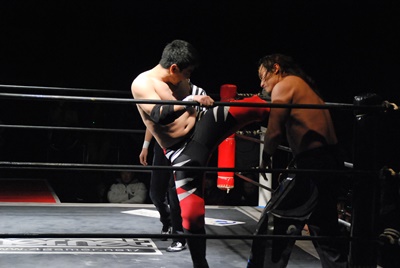 妻木コーナーに振る、大家切り返して突っ込む、妻木カウンターのキック。妻木ソバット、ミドルキック(右写真)、大家場外転落、妻木ロープに飛んでスライディングキック。