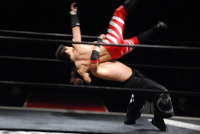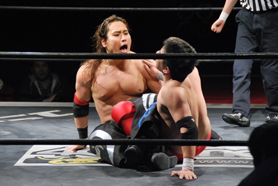 大家ハンマーロックに(右写真)、妻木切り返してヘッドロックからフライングメイヤー、大家ヘッドシザーズ。