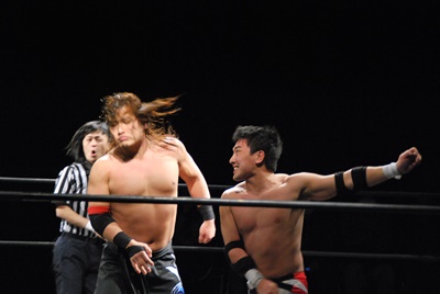 妻木再びフロントネックロック(右写真)、大家は持ち上げて場外に投げ捨てる。