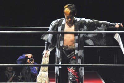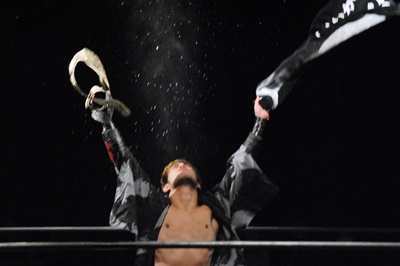 右手にはBJWタッグベルト、左手には「やり過ぎくらいがちょうどイイ!」タオル(左写真)。