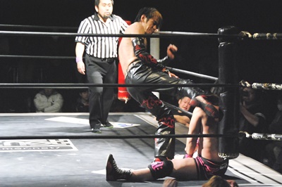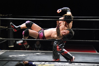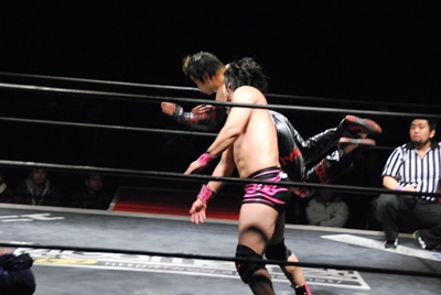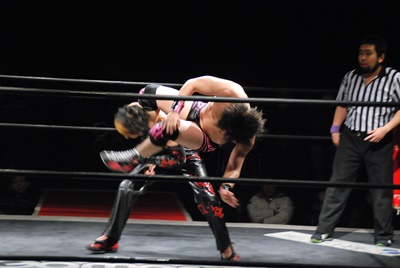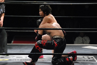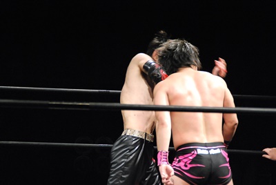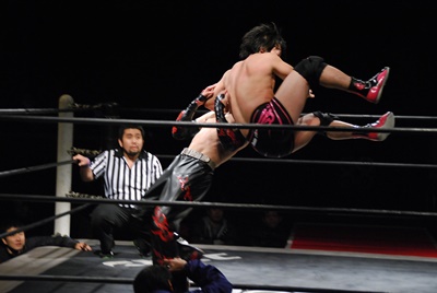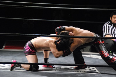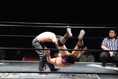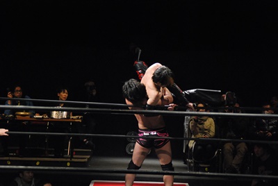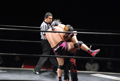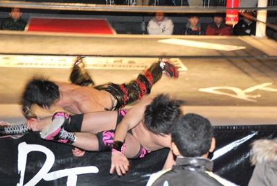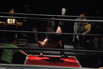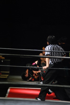 場外DDT(右写真)、リングに戻してカバー、カウント2。
