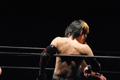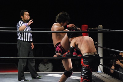 石井スリーパー、イサミ切り返す、対角線コーナーに振って突っ込む、石井フライングネックブリーカードロップ(左写真)。