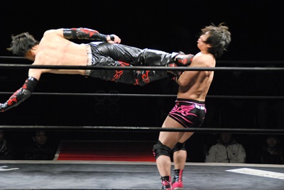 イサミトペ・スイシーダ狙う、石井は場外からジャンピングキック(左写真)。