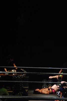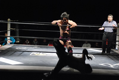 そのままトップロープ越しに場外に投げ落とす(右写真)。NWAルールなら一発反則負け。