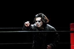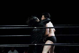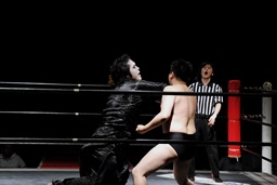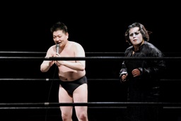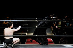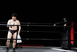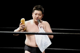 竜が「試合前にこのパンを食べてもらいます。ちょっと時間がかかりますので皆さんも各自ご飲食をお楽しみください。」と無理矢理パンを口に突っ込もうとするとSAGATは竜を場外に叩き出す(右写真)。