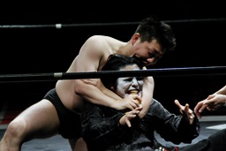 竜がパンの入ったビニル袋下げてリングイン。「僕の可愛い後輩のSAGATが中国人のせいで顔色が悪くなり、それを中国人は『キョンシーになった』とか言ってましたが、そんなことは科学的論理的法的に認められないことであり、SAGATは専門家の指導のもと健康的な生活を送ってようやくユニオンの仲間として帰ってました。SAGAT、出て来い!」(右写真)