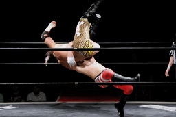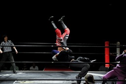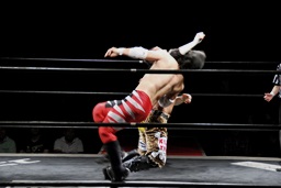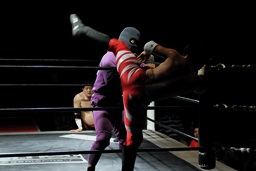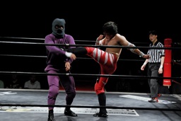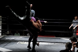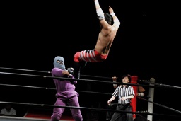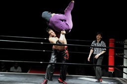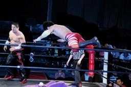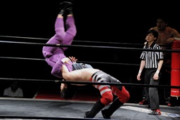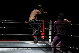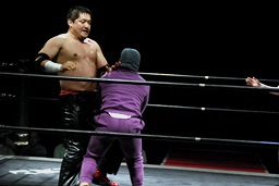 FUMAコーナーに上ってダイビングヘッドバット(左写真)、謎覆面Bが木曽レフェリーの足を引っ張ってカウント阻止。
