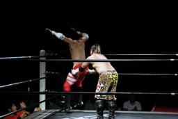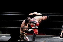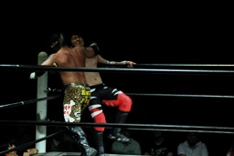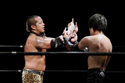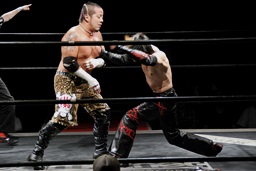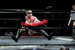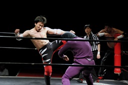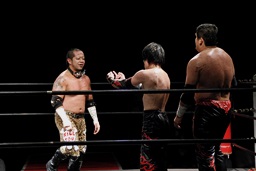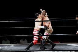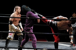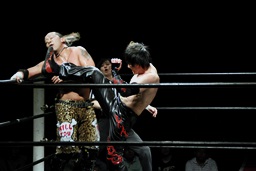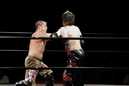 FUMAコーナーに振って突っ込む、MショルダースルーでFUMAをエプロンに出すがFUMAはエプロンからハイキック(右写真)。