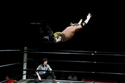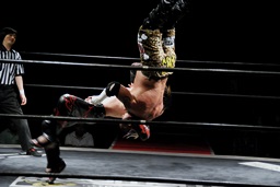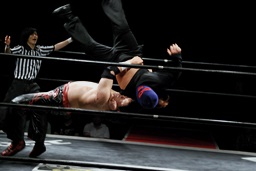 葛西コーナーに上ってパールハーバースプラッシュ(左写真)、カウント3。