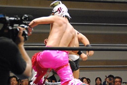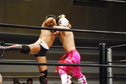 ダブルチョップ(右写真)、ヒップトスからニードロップ、カウント2。