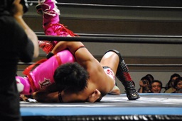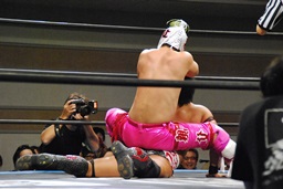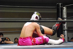 三富切り返すが親父はエビ固め(右写真)、カウント2。