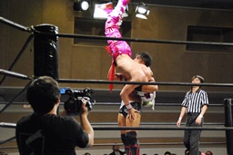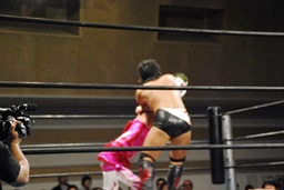 三富切り返してヘッドロック、親父ロープに振る、三富ショルダーブロック(右写真)。