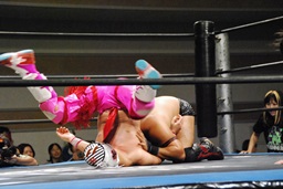 美央が足を蹴って転がすと両者の肩が着く(左写真)、木曽レフェリーカウント入れダブルフォールの裁定。