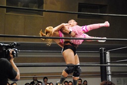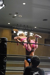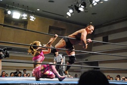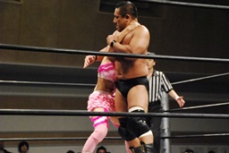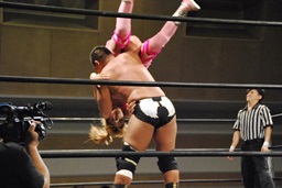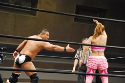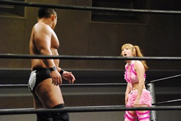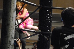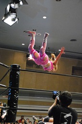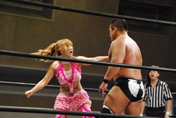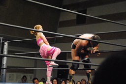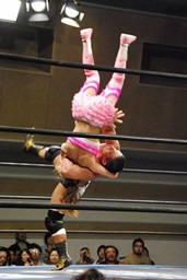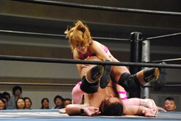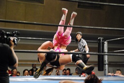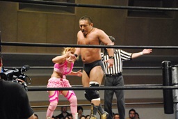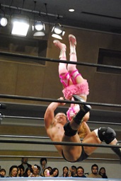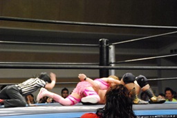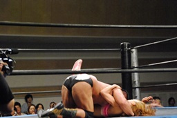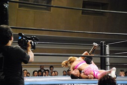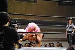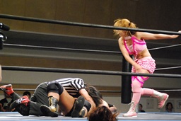 マットに叩きつけ(右写真)カウント2。逆エビ固め、チェリーロープ。