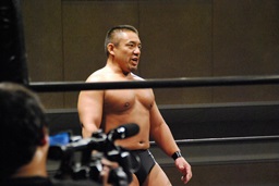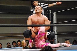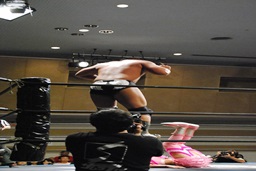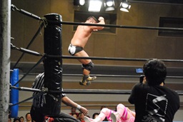 松田ボディスラム、コーナーに上ってダイビングエルボードロップ(左写真)、カウント2。10分経過。
