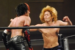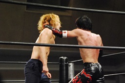 Pパンチ連打からパーフェクトプレックス狙う、イサミブロック(左写真)。