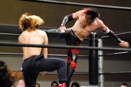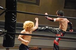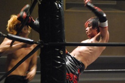 バズソーキックブロック(左写真)するがイサミはもう一回足出す八咫烏。