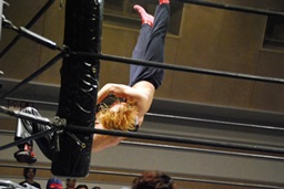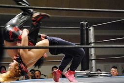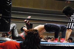 P串刺しラリアット、円華がコーナーに上る、Pイスを投げつける(右写真)。