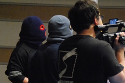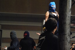「終わり」と聞いて慌てる謎覆面軍団(右写真)。