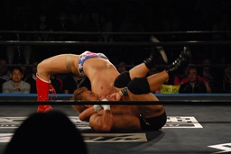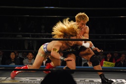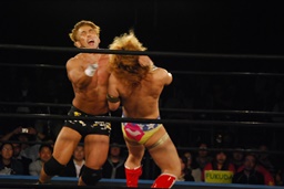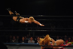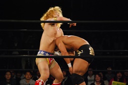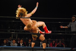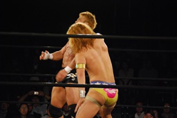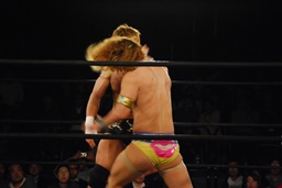 ロープに振ってバックエルボー、ロープに飛んでクォーラルボンバー(左写真)。
