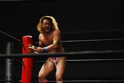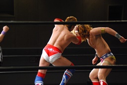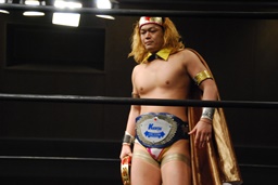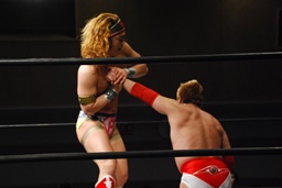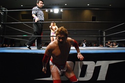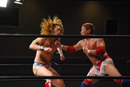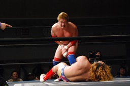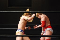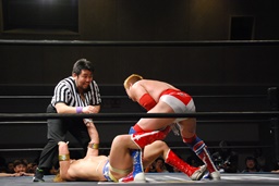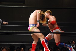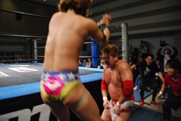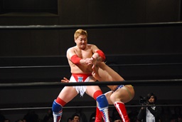 テイオーリングに戻りロックアップ、福田バック取る、テイオー腕を取る(右写真)、福田ロープ。