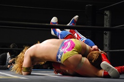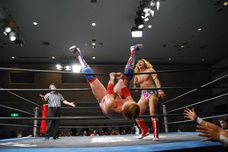 再度ロックアップ、テイオー腕取ってホイップ、福田ヘッドシザーズで返す(左写真)。