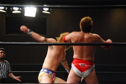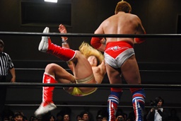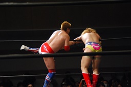 福田「No, I can't fight」とか言いながらサミング、テイオー体勢を崩しロープに引っかかる(左写真)。おお、テリーだ。