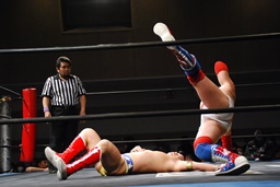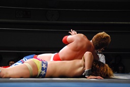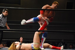 テイオー腕目がけてエルボースタッブ、首投げから腕へのフィストドロップ(左写真)、ハンマーロックから足を腕に引っ掛けて後ろ受身。