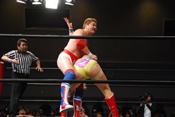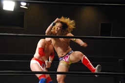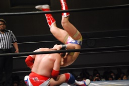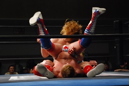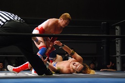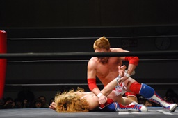 テイオーエルボースマッシュ連打、コブラツイストに(右写真)、福田切り返す、テイオーフルネルソンから再度コブラツイスト、福田ロープ。10分経過。