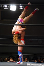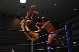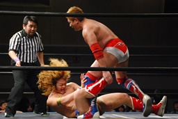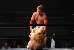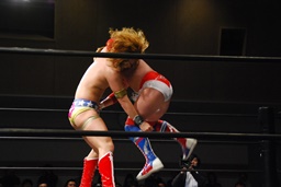福田コーナーに上る、テイオー立ち上がってデッドリードライヴ(左写真)。