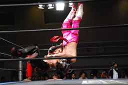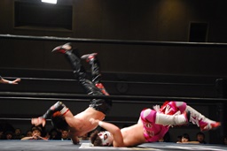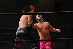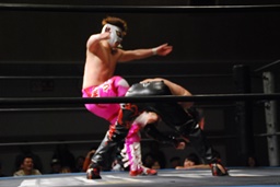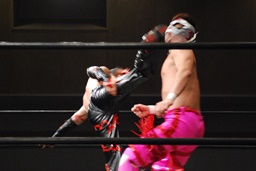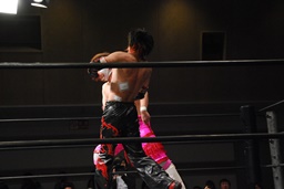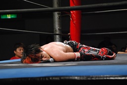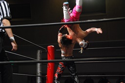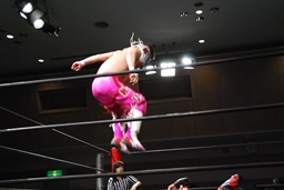 ロープに飛んで勇脚・斬(右写真)、カウント3。