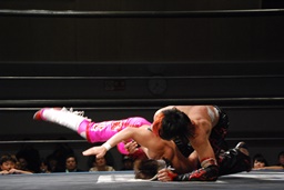 イサミブレーンバスター、親父ブロックしてミドルキック、イサミキャッチしてラリアット、親父かわして投げっぱなしジャーマン(右写真)。