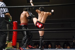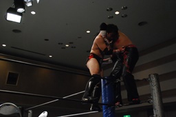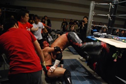 FUMAイスを石川の背中に立てかけてサッカーボールキック(右写真)。しかし金属面を蹴っていたためセコンドの竜が「逆!逆!」と声を掛けるがFUMA気づかず。